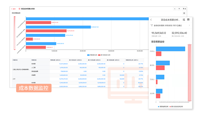 實(shí)時(shí)成本歸集,管理者可隨時(shí)掌握每一時(shí)點(diǎn)的收支、盈利狀況,即動(dòng)態(tài)成本和動(dòng)態(tài)利潤,并進(jìn)行對(duì)比分析;成本數(shù)據(jù)可鉆取查詢,想看任何一項(xiàng)數(shù)據(jù)都可直接追本溯源;成本預(yù)控預(yù)警,各項(xiàng)成本在預(yù)算控制中,施工過程中材料使用超標(biāo)或者少于標(biāo)準(zhǔn)用量,系統(tǒng)自動(dòng)觸發(fā)提醒,施工進(jìn)度百分比一目了然。