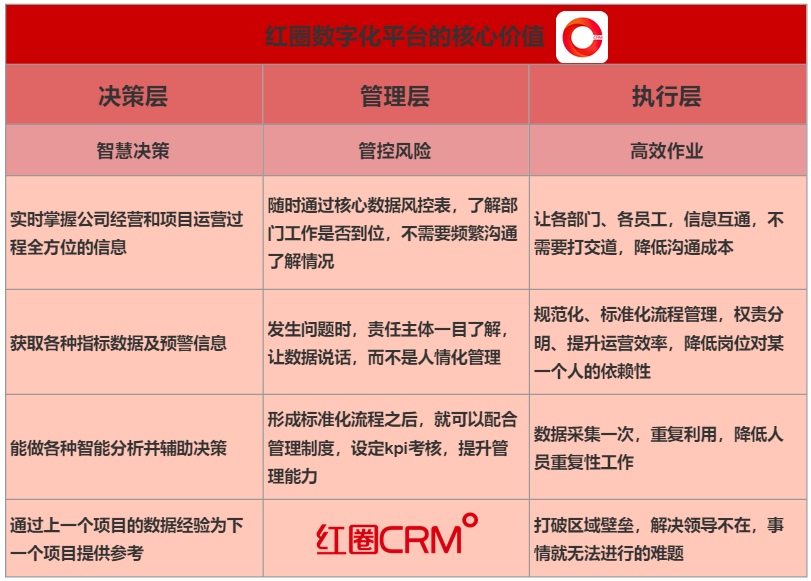 紅圈工程項目管理系統可實現數字管理。數據資產沉淀和分析,?撐組織決策。 服務于企業階段性目標的達成。 以組織建設、?才選拔,人才復制,提升組織能力。
