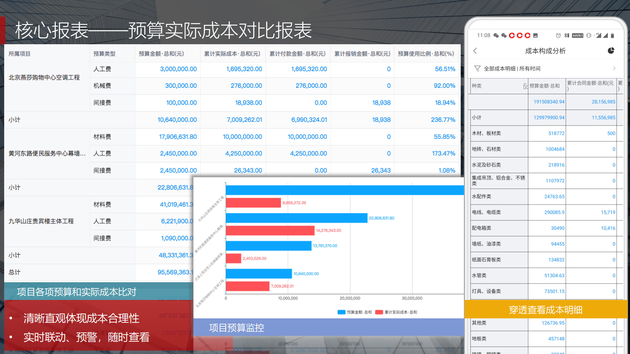 紅圈系統(tǒng)在PaaS平臺基礎上,根據(jù)工程項目管理的實際情況,通過人力資源管理、資金管理、成本管理、物資管理、安全質量管理、招投標管理、合同管理、勞務管理等功能模塊,利用報表引擎實時動態(tài)抓取項目管理過程中的相關數(shù)據(jù),實時動態(tài)展現(xiàn)公司整體項目運營情況。當某項科目設定額度一旦超出計劃指標時,系統(tǒng)會自動發(fā)送動態(tài)預警。為公司領導決策實時呈現(xiàn)動態(tài)智能數(shù)據(jù)分析,讓公司領導實時了解工程項目的整體運營效率及效益是否達標,經(jīng)營風險是否可控,真正做到項目管理心中有“數(shù)”,滿足公司對信息化管理的需求,提升公司經(jīng)營管理能力,實現(xiàn)工程項目全過程管理的降本增效。