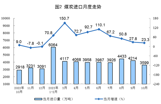 原煤生產(chǎn)增速加快,進口較快增長。10月份,生產(chǎn)原煤3.9億噸,同比增長3.8%,增速比9月份加快3.4個百分點,日均產(chǎn)量1254.0萬噸。進口煤炭3599萬噸,同比增長23.3%,增速比9月份回落4.5個百分點。