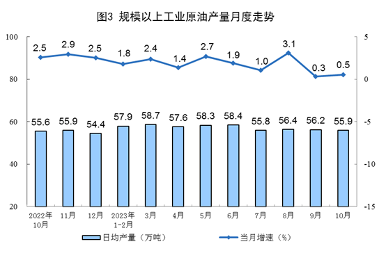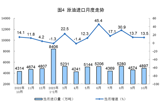 原油生產(chǎn)增速略有加快,進口保持較快增長。10月份,生產(chǎn)原油1733萬噸,同比增長0.5%,增速比9月份加快0.2個百分點,日均產(chǎn)量55.9萬噸。進口原油4897萬噸,同比增長13.5%,增速比9月份放緩0.2個百分點。