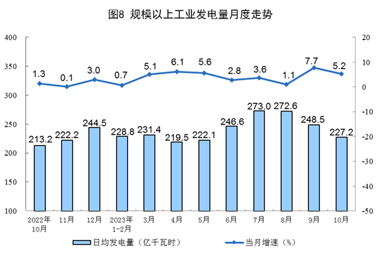 電力生產(chǎn)穩(wěn)步增長。10月份,發(fā)電量7044億千瓦時,同比增長5.2%,增速比9月份放緩2.5個百分點,日均發(fā)電227.2億千瓦時。1—10月份,發(fā)電量73330億千瓦時,同比增長4.4%。