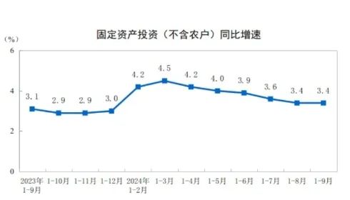 2024年1—9月份,全國固定資產(chǎn)投資(不含農(nóng)戶)378978億元,同比增長3.4%。其中,民間固定資產(chǎn)投資191001億元,下降0.2%。從環(huán)比看,9月份固定資產(chǎn)投資(不含農(nóng)戶)增長0.65%。