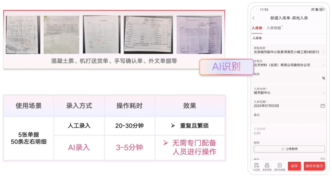 大量手寫確認(rèn)單、混凝土票據(jù)、支出合同、機(jī)打送貨單和辦公登記表的錄入任務(wù),不管是在出差途中或辦公場(chǎng)景中,員工只需將紙質(zhì)單據(jù)拍照上傳,即可實(shí)現(xiàn)一鍵識(shí)別與系統(tǒng)自動(dòng)錄入,徹底擺脫繁瑣工作、減少重復(fù)勞動(dòng)。