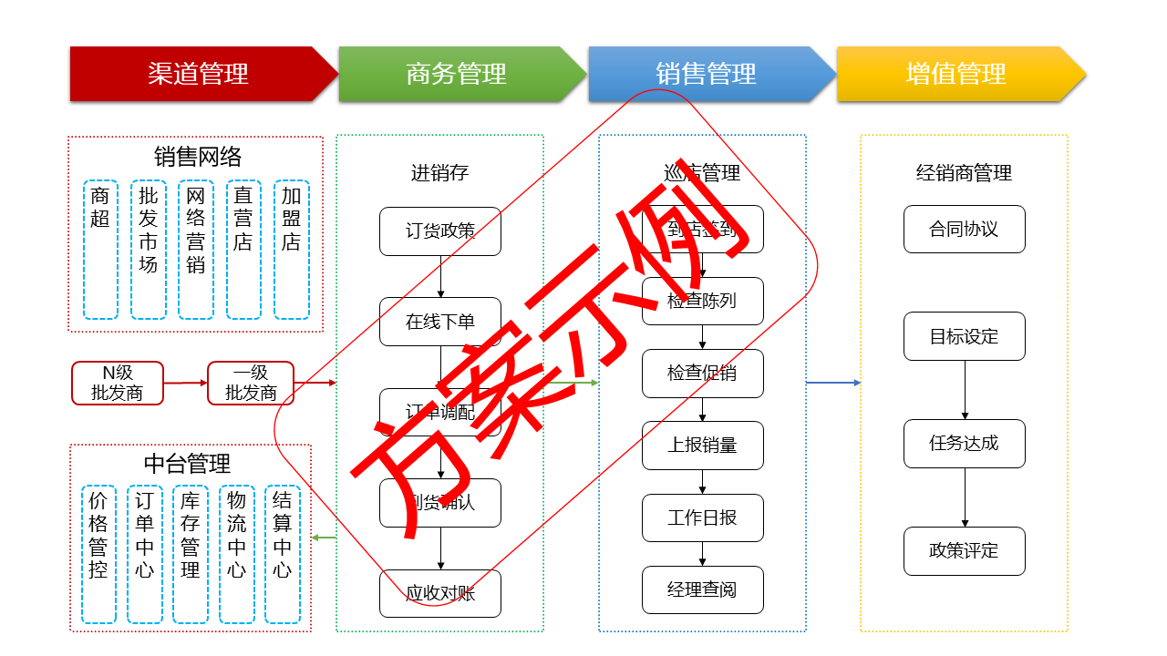 2. 分銷渠道管理,不同區域重點經銷商的策略,以保持營銷通路的整體暢通。企業對經銷商的經營信息進行及時的采集和匯總,并且獎勵那些按照企業策略及時出貨的通路,對于已經發生阻塞情況的通路盡快采取斷貨措施,或者尋找替代通路,以免出現全面的營銷通路連鎖反應。